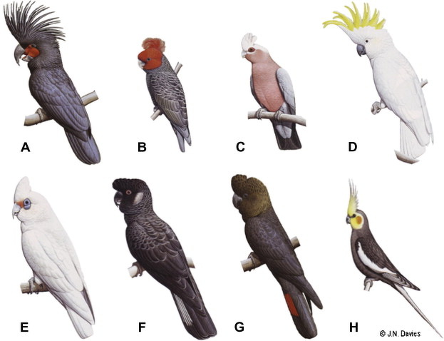 Some cockatoo species: A) Palm cockatoo (Probosciger aterrimus); B) Gang-gang cockatoo (Callocephalon fimbriatum); C) Galah (Eolophus roseicapillus); D) Sulphur-crested cockatoo (Cacatua galerita); E) Western corella (Cacatua pastinator); F) Baudin’s black-cockatoo (Calyptorhynchus baudinii); G) Glossy black-cockatoo (Calyptorhynchus lathami); and H) Cockatiel (Nymphicus hollandicus)