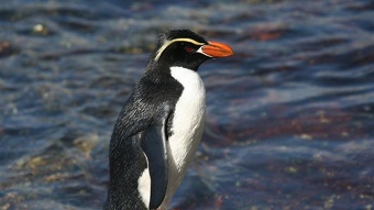 Snares penguins are yellow-crested penguins. They have dark blue-black upper parts and white underparts. Their most distinctive characteristic is a bright yellow eyebrow-stripe extends over the eye to form a drooping, bushy crest. The bill of the penguin is red-brown, with a bare pink base that distinguishes Snares penguins from their closest relatives Fiordland penguins.