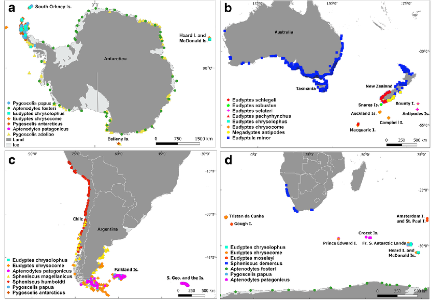 Penguin species nesting sites: a) Antarctica, b) Australia, New Zealand, surrounding sub-Antarctic islands, c) South America, d) South Africa, surrounding sub-Antarctic islands; New Zealand species: royal penguin (Eudyptes schlegeli), Snares Penguin (Eudyptula robustus), Erect-crested Penguin (Eudyptula sclateri), Fiordland Penguin (Eudyptula pachyrhynchus), Macaroni Penguin (Eudyptes chrysolophus), Southern Rockhopper: (Eudyptes chrysocome), yellow-eyed penguin (Megadyptes antipodes), little penguin (Eudyptula minor)