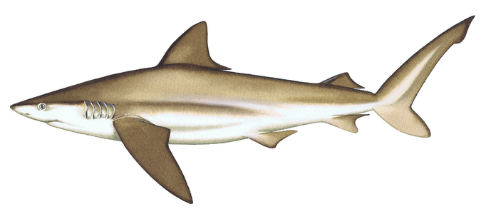 The back side of copper sharks is a brownish bronze or greyish bronze color. They have white banded flanks, and white on their undersides. Their snouts are long and narrow with a rounded or pointed tip. Their pectoral fins are long, and their dorsal fins are small and spineless, with posterior-facing tips. Their eyes are located on either side of the head. Besides the darker edges surrounding the fins, there are no clearly identifiable markings on the fins. It is uncommon for copper sharks to have an interdorsal ridge. |=|
