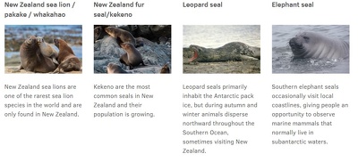 Most of the species found in New Zealand are sea lions and fur seals not real seals. Seals have furry, generally stubby front feet — thinly webbed flippers, actually, with a claw on each small toe — that seem petite in comparison to the mostly skin-covered, elongated fore flippers that sea lions possess. Sea lions have small flaps for outer ears. The "earless" or "true" seals lack external ears altogether. You have to get very close to see the tiny holes on the sides of a seal’s sleek head. Sea lions are noisy. Seals are quieter, vocalizing via soft grunts. [Source: NOAA]