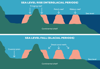 According to UNESCO: The Great Barrier Reef area has been exposed and flooded by at least four glacial and interglacial cycles, and over the past 15,000 years reefs have grown on the continental shelf. During glacial periods, sea levels dropped, exposing the reefs as flat-topped hills of eroded limestone. Large rivers meandered between these hills and the coastline extended further east. During interglacial periods, rising sea levels caused the formation of continental islands, coral cays and new phases of coral growth. This environmental history can be seen in cores of old massive corals.