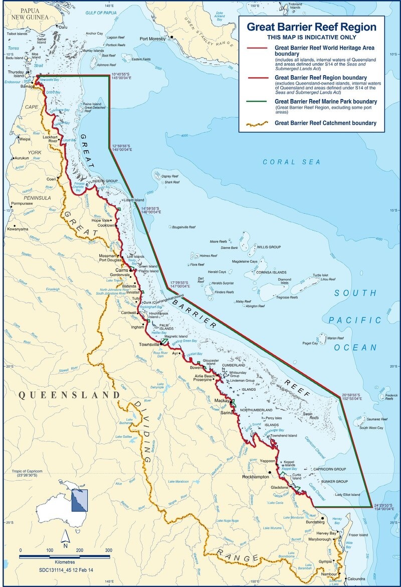 According to UNESCO The ecological integrity of the Great Barrier Reef is enhanced by the unparalleled size and current good state of conservation across the property. At the scale of the Great Barrier Reef ecosystem, most habitats or species groups have the capacity to recover from disturbance or withstand ongoing pressures. The property is largely intact and includes the fullest possible representation of marine ecological, physical and chemical processes. About 99 percent of the Great Barrier Reef lies within the Great Barrier Reef Marine Park. The park’s legal jurisdiction ends at low water mark along the mainland (with the exception of port areas) and around islands (with the exception of 70 Commonwealth managed islands which are part of the Marine Park). In addition the Great Barrier Reef also includes over 900 islands within the jurisdiction of Queensland, about half of which are declared as 'national parks', and the internal waters of Queensland that occur within the World Heritage boundary (including a number of long-established port areas). [Source: UNESCO]