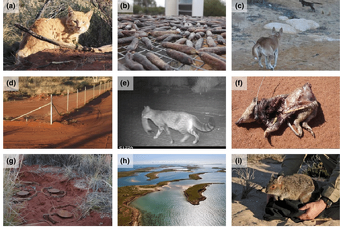 a) A feral cat Felis catus; b) Eradicat ® 1080 poison baits; c) dingo Canis dingo chasing a cat; d) cat exclusion fence at Matuwa; e) cat with a golden bandicoot Isoodon auratus in its mouth; f) radiocollared golden bandicoot preyed on by a cat outside the fence at Matuwa; g) padded foot-hold traps used to catch cats; h) Hermite Island, where feral cats and black rats Rattus rattus were eradicated and native mammals translocated to; i) spectacled hare-wallaby Lagorchestes conspicillatus being released on Hermite Island
