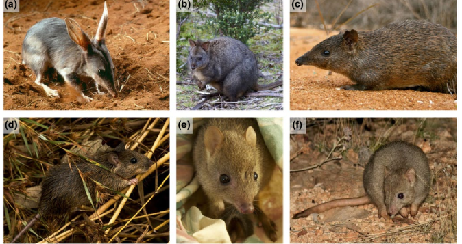 Some mammal species threatened by feral cats in Australia: a) greater bilby Macrotis lagotis; b) Tasmanian pademelon Thylogale billardierii; c) golden bandicoot Isoodon auratus; d) pale field rat Rattus tunneyi; e) juvenile woylie Bettongia penicillata; f) burrowing bettong Bettongia lesueur