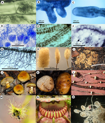 Southwestern Australia plants with mycorrhizal root types and other highly specialised nutrient uptake mechanisms: A) arbuscular mycorrhizas, B) ectomycorrhizas, or C) dual arbuscular mycorrhizas and ectomycorrhizas in Melaleuca hamata; D) orchid mycorrhizas in Pterostylis sanguinea; E) ericoid mycorrhizas in Leucopogon verticillatus; F) unique sub-epidermal associations of Thysanotus; G) long root hairs of a nonmycorrhizal carnivorous plant Drosera erythrorhiza; H) nonmycorrhizal cluster roots of Hakea prostrata; I) coralloid nitrogen-fixing roots of Macrozamia riedlei; J) ectomycorrhizal fungus Cortinarius sinapicolor; K) animal dispersed truffle-like ectomycorrhizal fungus Zelleromyces; L) parasitic root haustoria of Nuytsia floribunda; M) glandular leaf invertebrate traps of Drosera menziesii; N) leaf pitcher invertebrate traps of Cephalotus follicularis; and O) suction invertebrate traps of Utricularia multifida, Mark C Brundrett