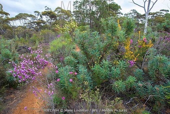 Kwongan soils and heath, dominated by orange Eremaea brevifolia, Lambswool bush (Lachnostachys eriobotrya) and other Spring flowers in Alexander Morrison National Park,