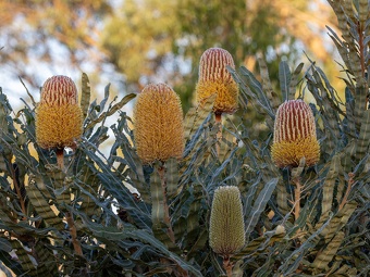 The 75 species of banksias grow only in Australia. Of these 60 grow only in southwest Australia. They produce inflorescence that consist of several thousand small florets grouped together in vertical line along a spike. The flowers colors are yellow, red and multi-colored. They take several months to develop and stay open for several weeks. Banksaias are named after the botanist Joseph Banks. The scarlet banksia produces a red flowers, whose sweet nectar has been used by Aboriginals for centuries to make a delicious drink.