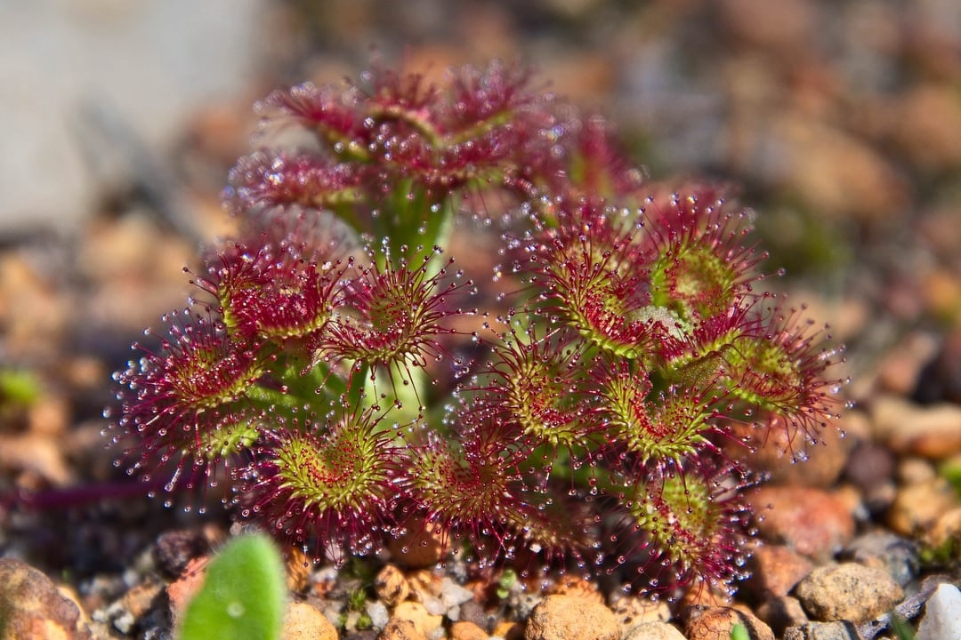 Tim Flannery wrote in Discover magazine: The poor soil promotes other survival strategies. Take, for example, the delicate, glistening carnivorous sundews (Drosera). Sixty-eight of the more than 160 sundew species in the world thrive in Australia’s southwest. During the wet winter and spring, their sticky leaves are astonishingly effective at trapping insects.