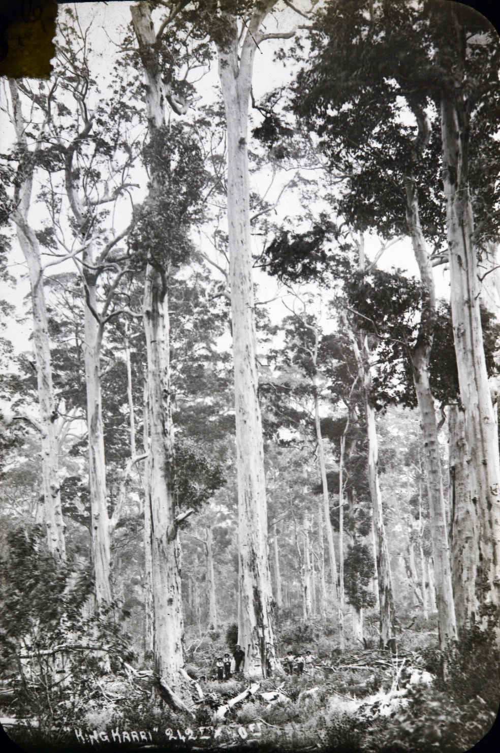 King Karri from 1900, showing its full trunk to about 40 meters; Notice the men at the base; The total volume of the tree is estimated at around 190 cubic meters