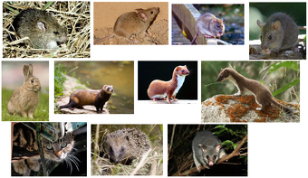 Eleven small introduced mammal species in New Zealand; Top row, left to right: Rattus exulans, Mus musculus, Rattus norvegicus, Rattus rattus; Middle row: Orycolagus cuniculus, Mustela furo,Mustela nivalis, Mustela erminea; Bottom row: Felis catus, Erinaceus europaeus, Trichosurus vulpecula