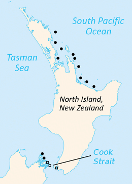 tuatara range: Circles represent the common; North Island tuatara, and squares the Brothers Island tuatara; Symbols may represent up to seven islands