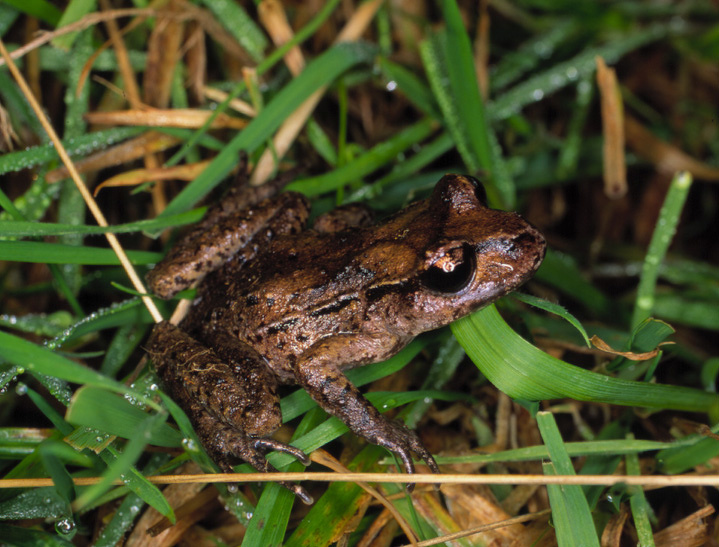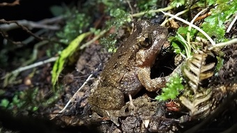 Hochstetter's frogs (Leiopelma hochstetteri) are also known as Hochstetter's New Zealand frogs. Primitive and Semi-aquatic. They are the most widespread New Zealand frog and found mostly in fragmented populations in northern North Island. hey are dark brown or dark in color and have partially webbed feet, yellow bellies, dark bands has more warts than the other native frogs. Males are are smaller than females. Males reach 3.8 centimeters (1.5 inches) and females reach five centimeters (2.0 inches) in snout–vent length.[Source: Wikipedia, New Zealand Government Department of Conservation]