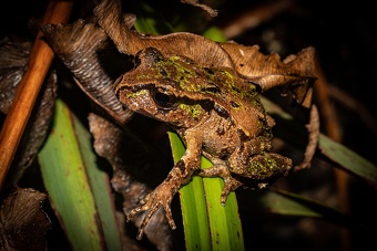 Threats to Hamilton’s frogs include predation by native tuataras, as well as introduced mammalian predators like black rats. Hamilton's frogs are well camouflaged. Their cryptic brown and slightly green coloration blends in well in the rocks, logs and vegetation that make up their habitat. When Hamilton’s frogs are disturbed they stiffens their body and remain motionless and can stay this way for a long period of time. They may also stiffen in upright position with their legs extended to deter predators. Hamilton’s frogs also secrete a distasteful substance from its granular glands to prevent being eaten by the predator. Although no cases have been reported in Hamilton’s frogs yet, the species may be susceptible to a deadly fungal disease called chytridiomycosis or chytrid fungus. The disease has been has been acquired by Archey’s frogs.