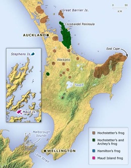 Fossil records show that Hamilton's frogs were once spread from Waikato south of Auckland in the North Island to Punakaiki in the central South Island of New Zealand. Now they survive only on two offshore islands — on 1) Takapourewa (Stephens Island) in the Cook Strait between the North and South Islands and on 2) Maud Island in the Marlborough Sounds. Boyj populations are is carefully managed by the DOC. The formerly named Maud Island frog is now considered genetically similar enough to Hamilton’s frog to be the same species. The populations of this species on Maud Island and Takapourewa (Stephens Island) are likely to have been separated since before people arrived in New Zealand and are managed today as separate populations. [Source: New Zealand Department of Conservation]