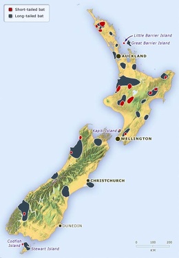 Long-tailed bats are very widespread and a patchy distribution. They are found on both of the main islands of New Zealand as well as on Stewart Island, Little Barrier Island, Great Barrier Island and Kapiti Island. They are considered extinct in urban habitats. One of the few main populations reside in Eglinton Valley, Fiordland.