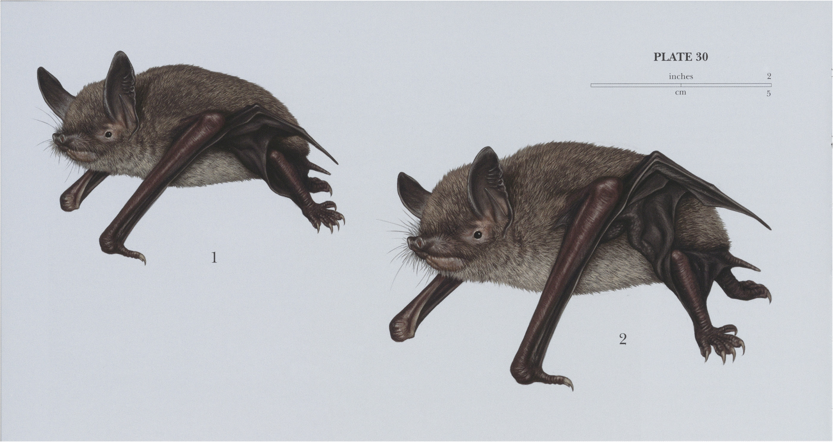 New Zealand greater short-tailed bats were medium-sized and extremely robust bats. They ranged in weight from 25 to 35 grams (0.88 to 1.23 ounces), with a head and body length of nine centimeters (3.54 inches) or more and a wingspan ranges of 29 to 31 centimeters (11.42 t 12.2 inches).They were about about one-third larger than New Zealand lesser short-tailed bata. Individuals had stocky bodies with prominent, pointed ears and nostrils and a set of short whiskers. The short tail penetrated the tail membrane on its dorsal surface. The hind legs and feet were very robust, positioned under the body for quadrupedal locomotion on the ground. The fur was dark brown. The tail measured approximately 1.5 centimeters in length. Source: Brendan Boyes, Animal Diversity Web (ADW) |=|]
