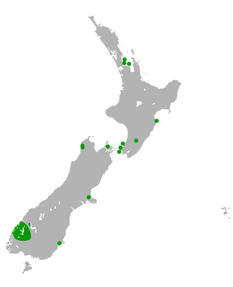 South Island takahe are endemic to New Zealand's South Island, where they reside in alpine tussocks grasslands and sub-alpine shrublands. Following conservation and reintroduction efforts South Island takahe have been introduced to the islands of Tiritiri Matangi, Kapiti, Mana, Maud, and Rarotoka, off the coast of New Zealand's South Island. Island populations live in modified grasslands. [Source: Jose Lara, Animal Diversity Web (ADW) |=|]