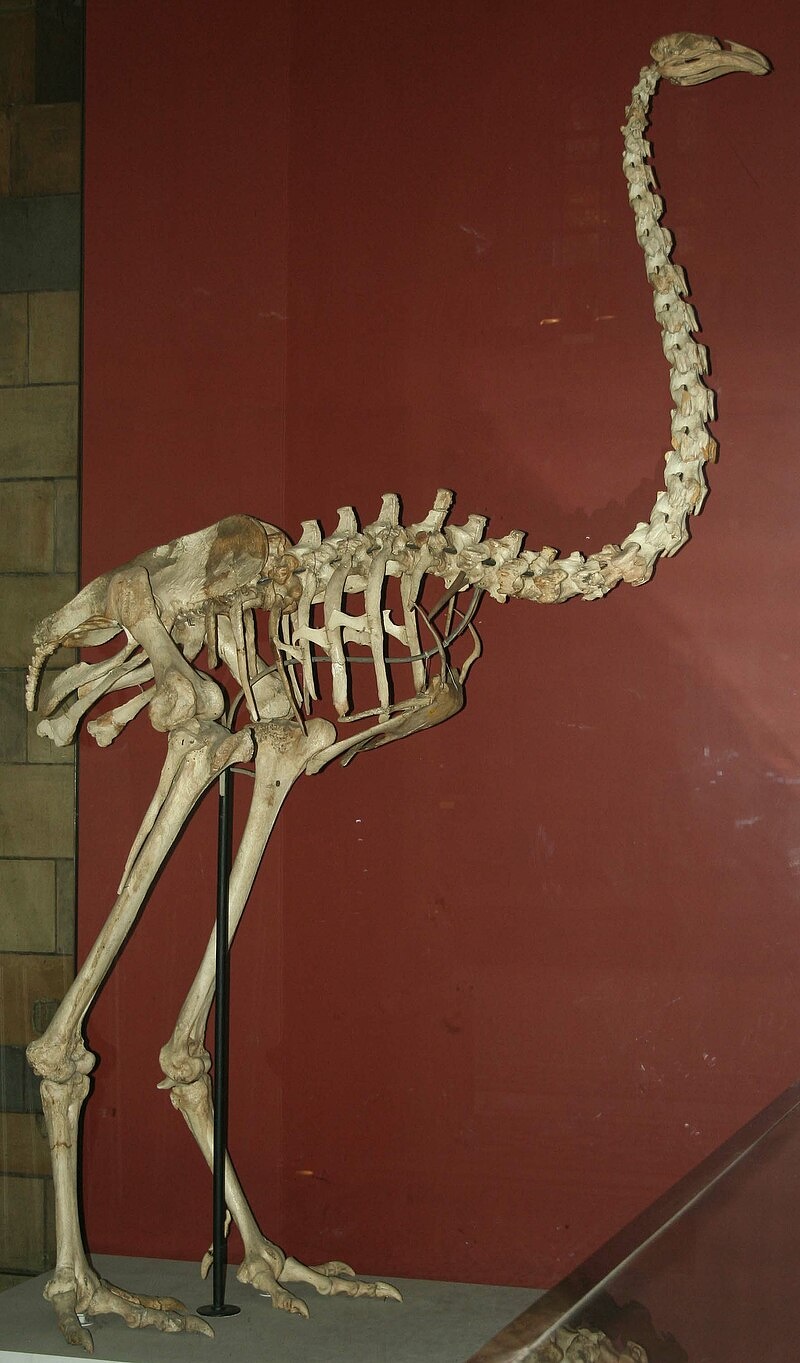 Moas were large flightless birds that looked like ostriches on steroids and are now extinct. They belonged to the order Dinornithiformes and were endemic to New Zealand. There were nine species of them. The largest were about 3.6 meters (13 feet) tall with their neck outstretched and the smallest were about the size of a turkey. Medium size moas stood about 1.2 meters (four feet) tall, about the size of a rhea or cassowary.