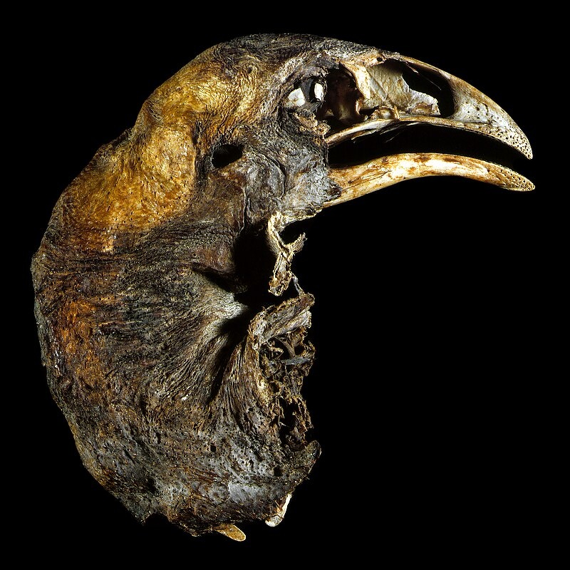 Several examples of moa remains have been found with soft tissues (muscle, skin, feathers) preserved through desiccation after the bird died at a dry site. Most were found in the semiarid Central Otago region, the driest part of New Zealand. Loose moa feathers have been collected from caves and rock shelters in the southern South Island. The preserved leg of M. didinus from the Old Man Range reveals that this species was feathered right down to the foot. This is likely to have been an adaptation to living in high-altitude, snowy environments, and is also seen in Darwin’s rhea, which lives in a similar seasonally snowy habitat. There is evidence of moa feathers being up to 23 centimeters (9 inches) long, and came in a range of colors including reddish-brown, white, yellowish, purplish and dark with white or creamy tips.