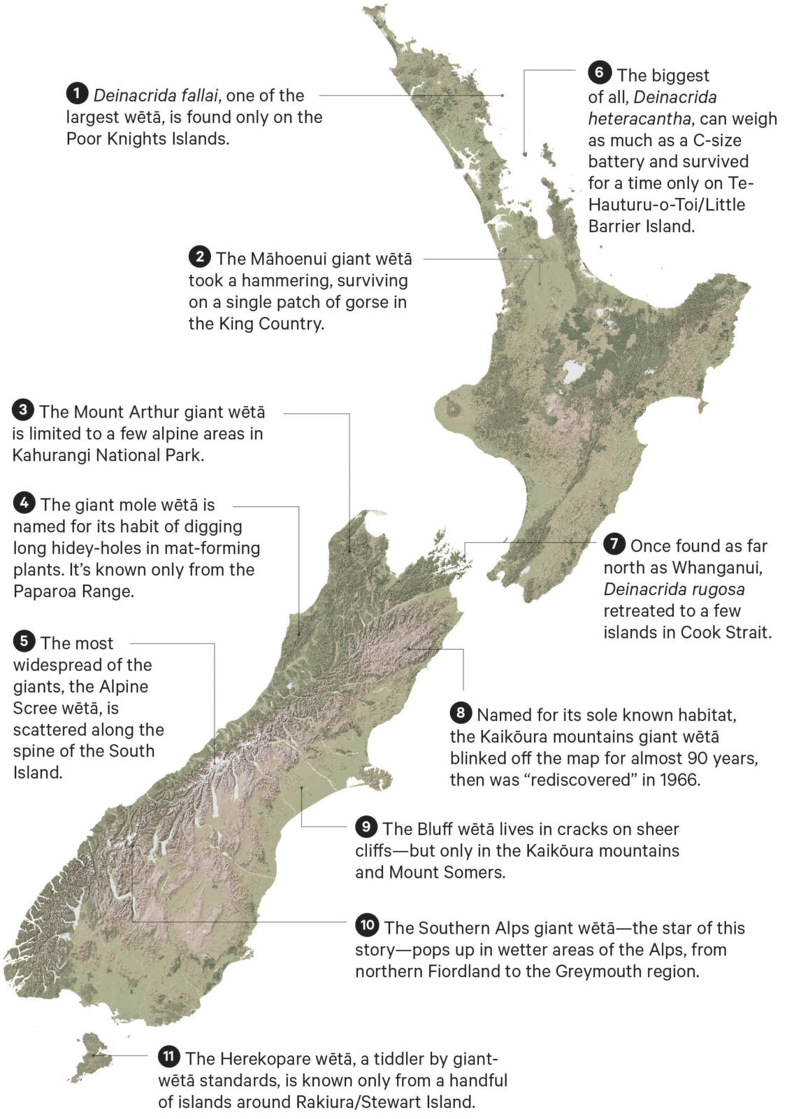 See below right for the names and ranges of these weta , From New Zealand Geographic