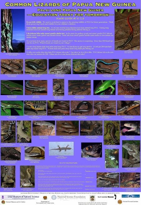 Crocodile monitors are the second largest lizard after Komodo dragon. The sometimes prey on wallabies. Many of the lizard species are skinks such as endemic New Britain crocodile skinks and Admiralty crocodile skinks. Pig-nosed turtles, also known as Fly River turtle, is a unique species found in New Guinea. Parker's snake-necked turtle is endemic to the Fly River. Saltwater crocodiles are the largest native reptile and the largest reptile period. They are mainly found in New Guinea's river mouths and estuaries. New Guinea crocodiles are endemic to New Guinea and much smaller than saltwater crocodiles.
