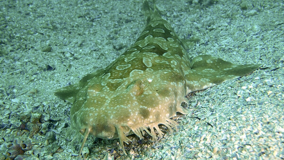 Spotted wobbegongs (Orectolobus maculatus) look like a cross between a moving piece of coral and a rug. Also known as carpet sharks, catsharks, tassel sharks and wobbegongs, they often sit camouflaged on the ocean bottom, partly buried in the sand like a skate to ray, ambushing predators that pass by. Spotted wobbegongs are species a carpet shark in the family Orectolobidae found off the coast of southern and southeastern Australia. Green, yellow, or brown in color, they are fairly large, typically reaching 1.5 to 1.8 meters (4.9 to 5.9 feet) in length and have distinctive O-shaped spots all over their body. They have bitten humans, sometimes unprovoked, and have caused severe wounds. The species is fished commercially in Australia, but it is not severely threatened. They are listed as a least-concern species on the IUCN Red List. There 11 species of wobbegong shark, found mainly in the eastern Indian Ocean and western Pacific Ocean.
