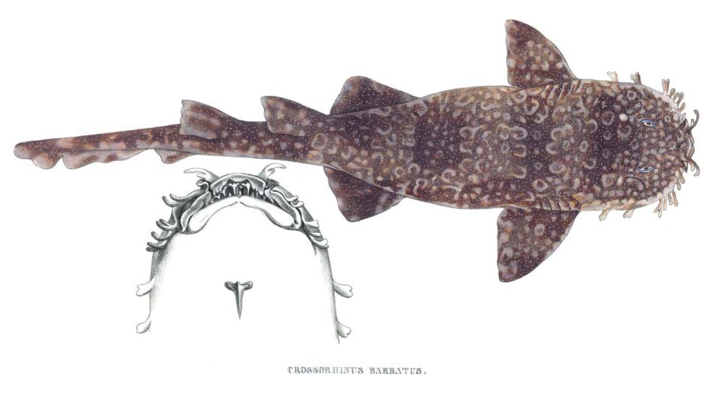 Spotted wobbegongs have a specialized jaw protrusion that is not found in most other shark species. The palatoquadrate (cartilaginous structure or bones forming the upper jaw and roof of the mouth) and Meckel’s cartilage (cartilaginous structure in jawbone) project forward and are the major component of protrusion. The movement of these jaw structures simultaneously enlarges the oral cavity to generate much of the suction forces. This sucking force created by this protrusion, the shark’s powerful jaws and multiple rows of enlarged fang-like teeth in the upper and lower jaw make spotted wobbegongs formidable predators. /=\