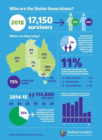 Terry Olsen was taken from his aunt and grandmother in 1973 on a routine visit to a clinic to an immunization injection and taken to a white family a thousand miles away. One man from Tasmania who was taken to Queensland told ABC rabio: "I'm part of the Stolen Generation — 15 kids mum had, I was the only one in the family taken away from Tasmania."