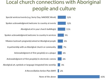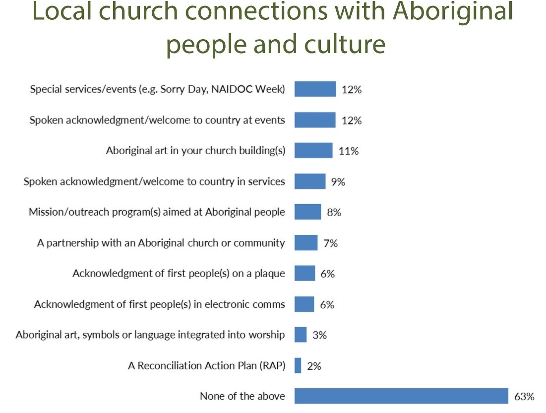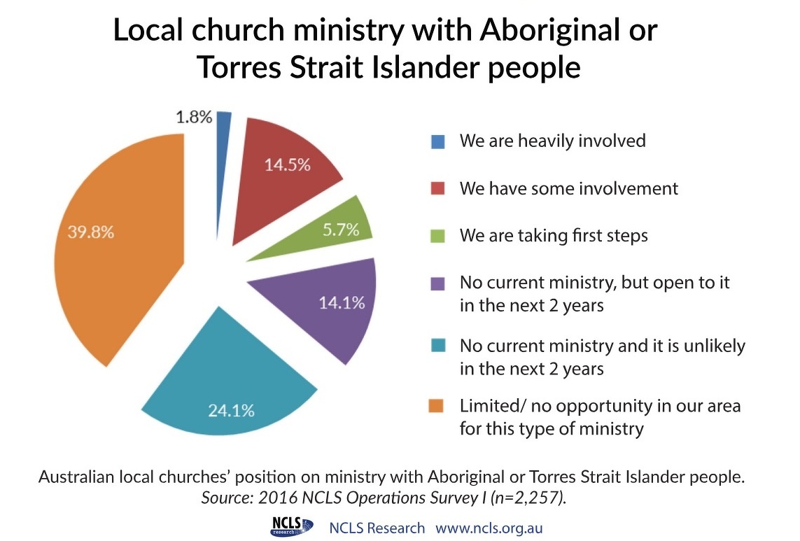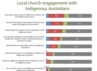Non-indigenous church involvement with indigenous Australians (Aboriginals): Frequently (blue); occasionally (rusty red); once (green); never (grey)