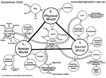 Traditional Aboriginal religion revolves around "Dreaming" (also known as Aboriginal Dreaming, the Dreaming and Tjukurrpa) — a philosophy and belief system that connects people to the spiritual realm, their land, ancestors, and the creation of the world. It encompasses the story of the Ancestral Spirits, who created the world, the laws for living, and all life. It is a holistic system that connects the past, present, and future, shaping Aboriginal identity, culture, and spirituality, and is shared through stories, art, songs, dances, and rituals.