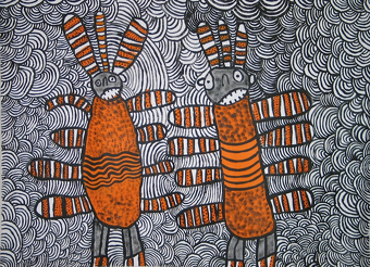 The monstrousness of many, although not all, of these monstrous Desert Beings lies in their particular disposition towards cannibalism. In the farthest reaches of the Western Desert, in the Pilbara region, the brilliant although largely unheralded Martu artist and animator Yunkurra Billy Atkins creates extraordinarily graphic images of cannibal beings, including babies. These ancient, malevolent Ngayurnangalku (Cannibal Beings) have sharp pointy teeth and curved, claw-like fingernails. They reside beneath a salt lake, Kumpupirntily (Lake Disappointment). In those environs they have been known to stalk and to feast on human prey – to be precise, Martu people.