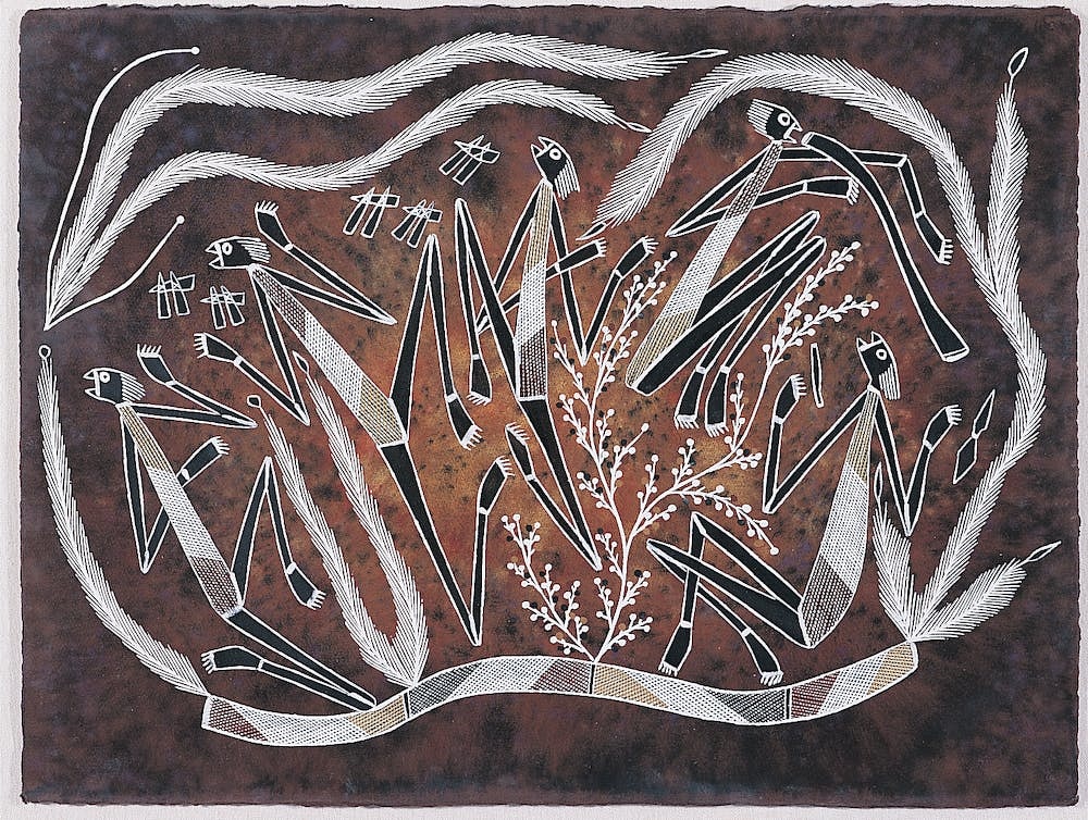 Ancestral beings can have a benign or malevolent influence on people and provide valuable information on where to find water or hunt game. They can also provide advice on family, clan and martial relationships. Common ancestral spirits found in northern Australia include Djangkawu, who traveled with and elaborate dilly bag and digging stick used to create water holes; the Wagilag Sisters, linked with water holes and snakes; the Rainbow serpent Yingarna and her offspring Ngalyod; and the Mimi spirits, who are credited with teaching the Aboriginals things like hunting, food gathering and painting.