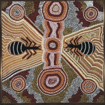 The ancestral heroes had designs on their bodies that carried the life force. These designs are reproduced in ceremonies today by men and women to renew the life force by recreating the founding dramas of their world. In addition to the ancestral beings, mildly malevolent spirits called gugu are often invoked to keep children close to adults at night and away from areas where men hold ceremonies. Mungamunga, female ancestral spirits, may appear to men or women in dreams with new songs, dances, or designs. Large or permanent bodies of water are thought to harbor rainbow serpents that can be offended if proper precautions are not taken. |~|