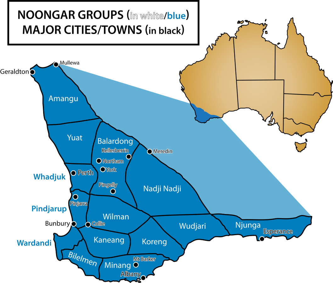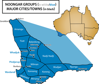 The Noongar are an Aboriginal Australian people that live in the south-west corner of Western Australia from Geraldton on the west coast to Esperance on the south coast, with a large concentration in the Perth metropolitan area. Also known and spelled as Noongah, Nyungar, Nyoongar, Nyoongah, Nyungah, Nyugah, and Yunga, the Noongar cultural bloc comprise 14 different groups; Amangu, Ballardong, Yued, Kaneang, Koreng, Mineng, Njakinjaki, Njunga, Pibelmen, Pindjarup, Wadandi, Whadjuk, Wiilman and Wudjari. The Noongar people refer to their land as Noongar boodja. The word Noongar comes from a word originally meaning "man" or "person". [Source: Wikipedia]
