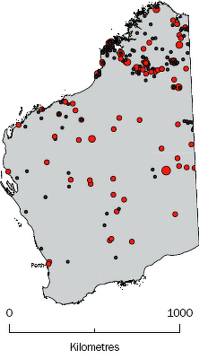 Indigenous communities in Western Australia based on Australian Bureau of Statistics data from 2006l 1) Large red dot: 500 people or more; 2) Medium red dot: 200 to 499; 3) Small red dot: 50 to 199; 4) Small back dot: less than 50 people