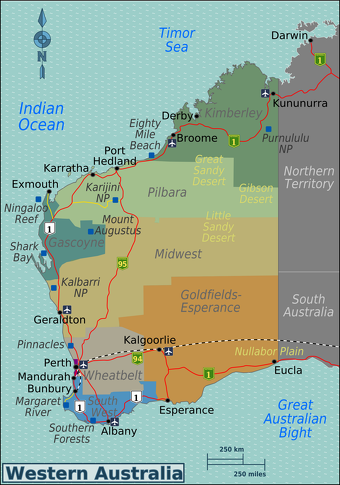 The northwestern part of Western Australia, a chunk of land in larger than Alaska, is home to only 100,000 or so people, many of them Aboriginals or miners who commute hundred of miles very month to see their families in Perth. In much the northern part of Western Australia, the Outback runs right to the sea. Large chunks of land here are owned by Aboriginals. The most interesting areas here are the Kimberly in the extreme north, a region with a rugged coastline and deep gorges, and the Pilbara region, further south, in the in the central Western Australia Outback, with magnificent rock scenery, vast mineral wealth (mostly natural gas and iron) and blistering hot temperatures. Pilbara ironically means "fish" in the local Aboriginal language. Most of the towns in the regions are connected somehow to the mining industry. If you drive here, be prepared with lots of water and fuel.