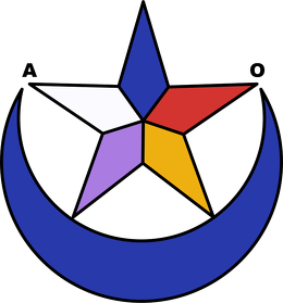 The main symbol (tohu) of the church is the whetū marama (“shining star”), a five-pointed star and crescent moon that appears on church buildings and is worn by followers. The crescent moon, in gold or blue, represents enlightenment, while the star’s colours each signify an aspect of divine presence: blue for Te Matua (The Father), white for Te Tama (The Son), red for Te Wairua Tapu (The Holy Spirit), purple for Nga Anahera Pono (The Faithful Angels), and gold or yellow for Te Mangai (The Mouthpiece of God, or Ture Wairua). In some cases, pink replaces gold to represent Piri Wiri Tua (The Campaigner in Political Matters, or Ture Tangata). Together, Te Whetū Marama symbolizes the kingdom of light (Maramatanga), standing steadfast against the forces of darkness (makutu).