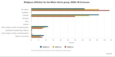 Approximately 29.9 percent of Māori identified as Christian in the 2018 New Zealand census, a significant drop from 46.2 percent in 2006. The percentage of those with "no religion" increased to 53.5 percent in the same time period. The decrease in Christian affiliation is attributed to factors including the colonial history of religion and a broader rejection of traditional religious frameworks.
