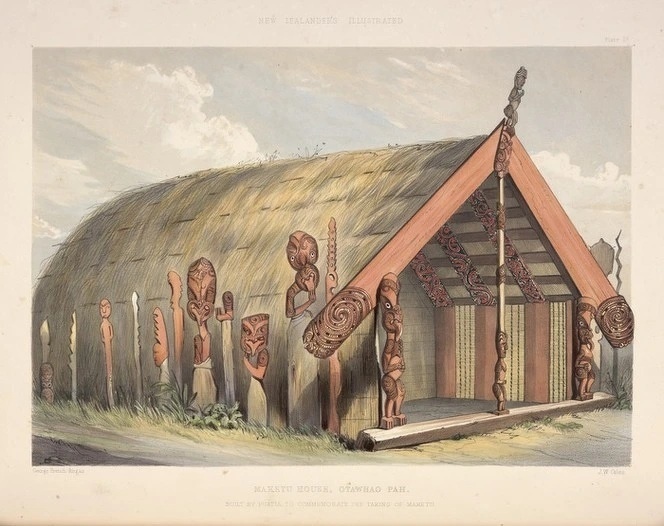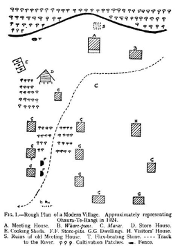 The principle building in a Māori villages have traditionally been ithe marae near the entrance. Only structures and other spaces with tapu functions (such as the chief’s house) could front onto the marae atua, and helped to define this space. Other noa structures, such as cooking buildings and storage platforms, were kept at a distance from the marae atua so as not to disturb the tapu status.