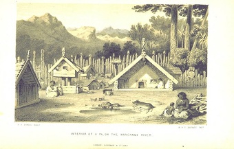 Māori villages traditionally have been orientated toward flat (or slightly lower) open ground, with the ‘back’ of the settlement closed in using the physical landscape, such as forest or higher ground. A social hierarchy has been associated to the layout, with restricted and sacred (tapu) uses near the entrance, and unrestricted and ordinary (noa) uses further into the settlement. [Source: Henry Fisher, an introduction to the vernacular architecture of New Zealand, Victoria University of Wellington, 2012 ^^]