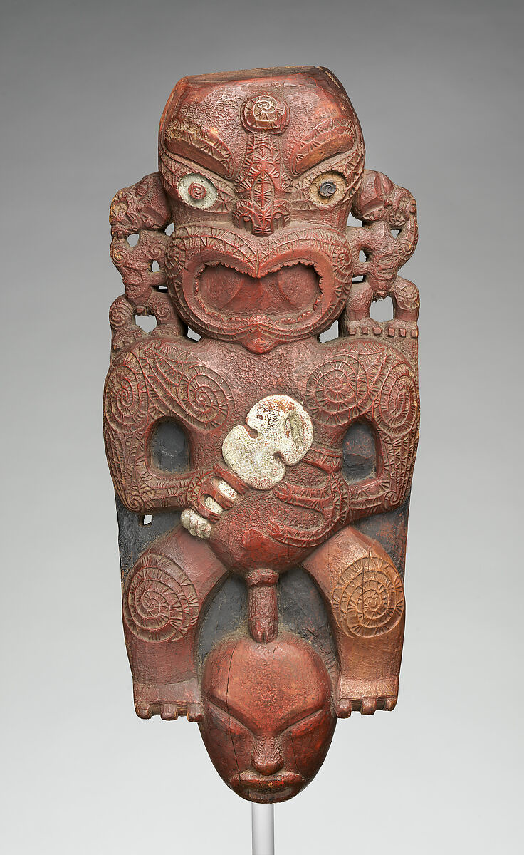 The Metropolitan Museum of Art collection contains a House Post Figure (Amo) made of wood and date to around 1800. It originates from somewhere in New Zealand and measures 109.2 × 27.9 × 12.7 centimeters (43 inches high, with a width of 11 inches and a depth of 5 inches). According to museum: Depicting an ancestor from the Te Arawa region, this panel once adorned a Māori meeting house and may depict an ancient warrior. The sense of fierce movement conveyed in the stylized depiction of the arms indicate's that the figure is likely engaged in a war dance, while his tongue is thrust out in defiance of his people's enemies. [Source: Metropolitan Museum of Art]