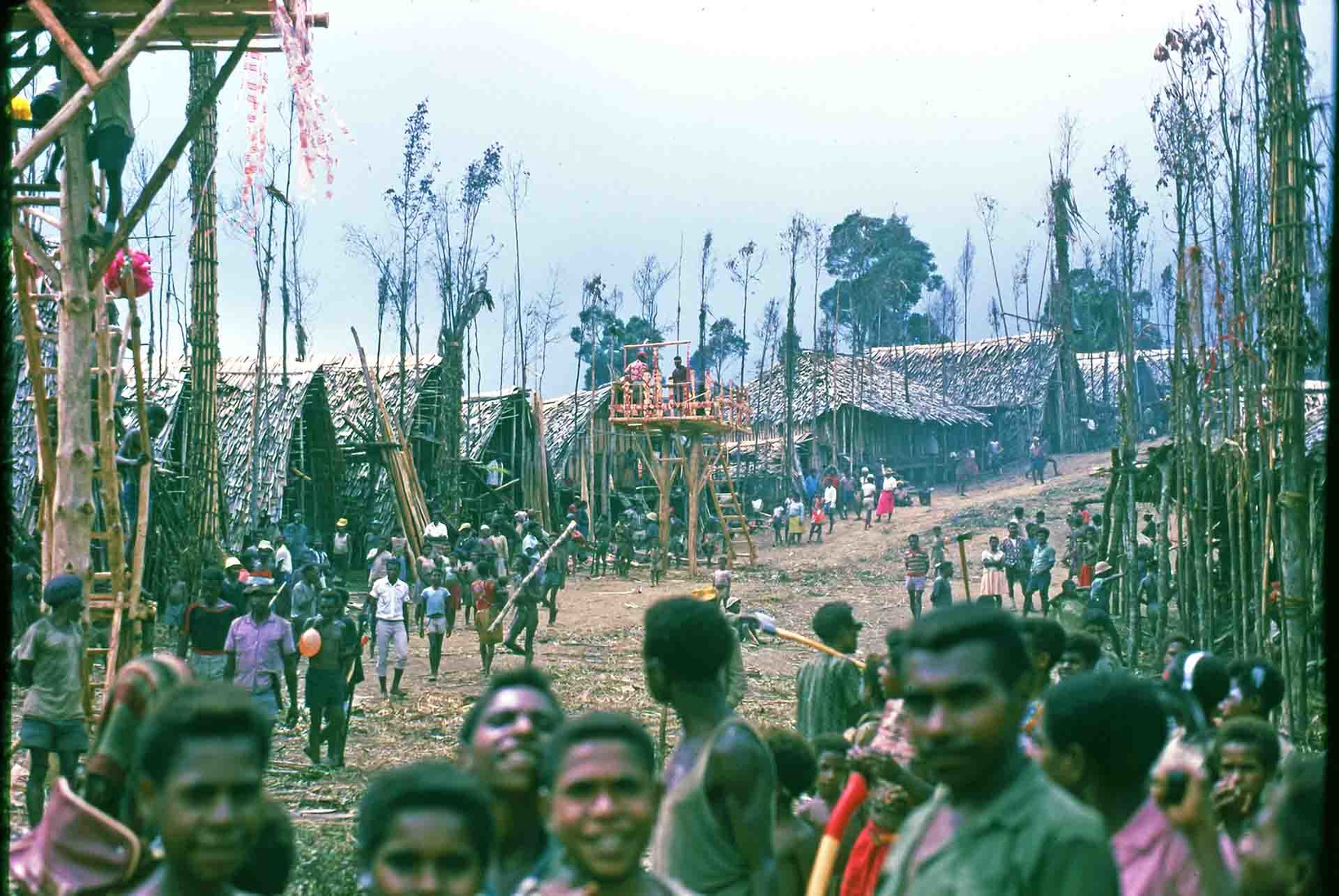 Settlement patterns are characterized by scattered hamlets averaging forty-five inhabitants and about fifteen houses (fewer today), typically situated on ridge crests near the forest margin. Houses are arranged in two parallel rows occupied by women and children, while men’s houses at the head of the rows traditionally accommodated married men and bachelors. In recent times, men’s houses have largely fallen into disuse. In precolonial periods, hamlets were enclosed by stockades, and the open spaces between houses served as venues for feasts and dances. Houses are often sheltered by windbreaks of Cordyline terminalis. Hamlets are occupied for limited periods before being abandoned, though sites are frequently reoccupied after intervals of time. Large ceremonial villages, occasionally containing seventy or more houses, are constructed for major rituals and inhabited only temporarily.