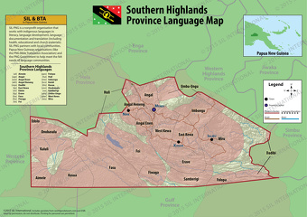 Southern Highlands Province is divided into thre distinct geographic cultural regions: 1) The West, which includes the districts of Nipa, Mendi, Lai Valley, Imbogu (lower Mendi), Hela District of Magarima, Kutubu and part of Kendep (Enga Province) and is primarily home to speakers of dialects of the Anggal Heneng language; 2) The East, which includes districts like Kagua, Ialibu, Pangia and Erave, where languages such as Imbongu, Kewa, and Wiru are spoken; and 3) The Lowlands, which stretch across the southern part of the Southern Highlands province from the volcanic peaks of Mount Bosavi to the oilfields of Lake Kutubu, and includes the language groups of Biami, Foe, and Fasu.