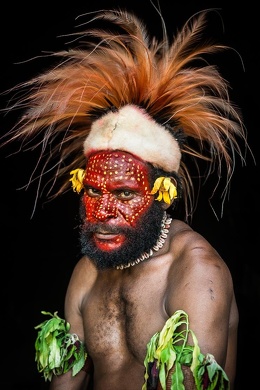Foi tribesemen in Daga Village, Lake Kutubu, red is the color for mature men anyway in away