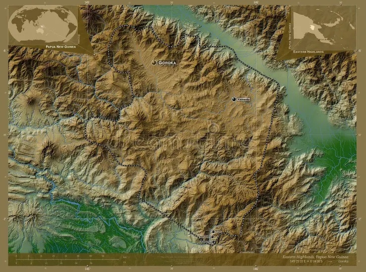 The Eastern Highlands province (EHP) covers an area of 11,157 square kilometers (4,308 square miles) and has a population of 784,835 people according to the 2021 census, making it Papua New Guinea’s second most populous provinces. It also one of the fastest growing the population was 579,825 in 2011 according to the census that year. The Eastern H highlands province shares borders with Madang Province to the north, Morobe Province to the east, Gulf Province to the south, and Simbu (Chimbu) Province to the west. The province is the home of the Asaro mud men and is usually reached by air from Goroka Airport or by road on the main Highlands Highway.