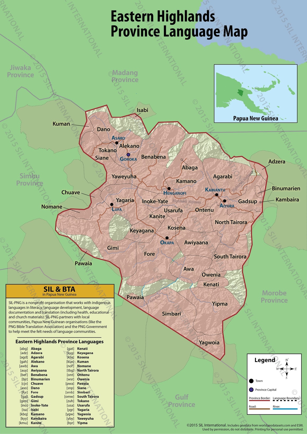 Language: Tairora (Tairoa) is a Kainantu language and a member of the Eastern Family of Non-Austronesian Languages in the East New Guinea Highlands group. Many Tairora are bilingual with neighboring languages (Agarabi, Auyana, Binumarien, Gadsup, and Kamano in the north; Awa and Waffa in the south) and currently most males and younger women are fluent in Tok Pisin. Summer Institute of Linguistics translators have produced a considerable amount of religious and educational material in Tairora, but the number of people who are literate in their own language is still fairly small. 1) Dialects of Tairoa proper (North Tairoa) include Aantantara (Andandara), Arau-Varosia (Arau-Barosia), Arokaara, Saiqora (Sai’ora), Tairora. 2) Dialects of South Tairoa (Omwunra-Toqura) include Aatasaara (Atakara), Haaviqinra-Oraura (Habina-Oraura), Omwunra-Toqura (Obura-To’okena), Vaira-Ntosara (Baira), Veqaura (Meauna), Vinaata-Konkompira (Pinata-Konkombira).