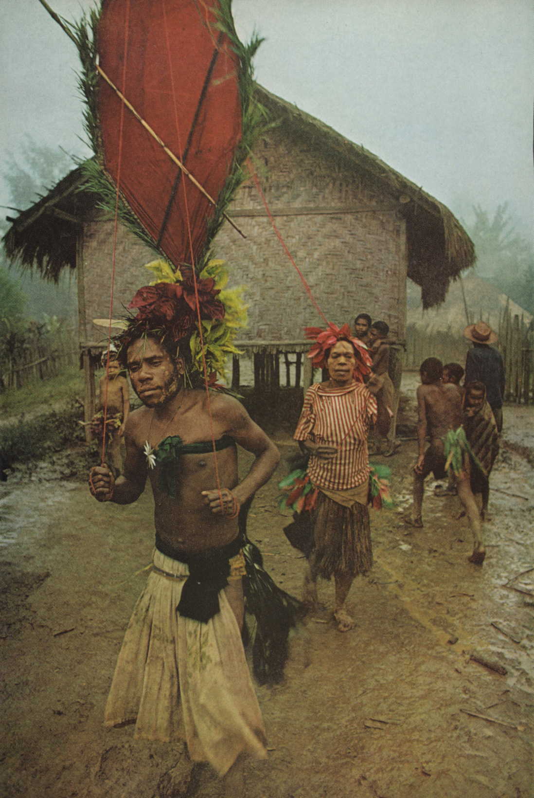 Gimi people adorned themselves in magnificent costumes when performing all-night dramas in their villages. The costumes, made from materials found in the forest — such as bamboo, grass, and natural paints — are too elaborate to describe here. Check Geographic articles “The Gimi People” and “Living Theater” sourced above.