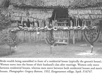 Traditionally among the Iatmul, several closely related nuclear families typically shared a single dwelling. Within the large house, each family occupied its own section, and within that space, husbands and wives maintained separate sleeping compartments. Co-wives and the wives of brothers were expected to cooperate as a single domestic unit, working together in daily subsistence activities such as food preparation, sago processing, and childcare. [Source: Wikipedia, Brigitta Hauser-Schäublin, “Encyclopedia of World Cultures, Volume 2: Oceania,” edited by Terence E. Hays, 1996; J. Williams, “Worldmark Encyclopedia of Cultures and Daily Life,” Cengage Learning, 2009]