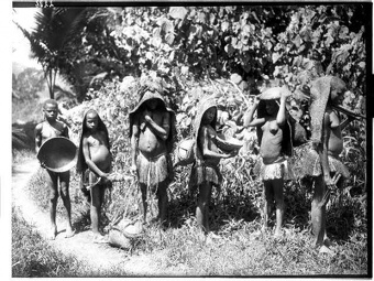 Women on their way to a pottery market near Aibom village; they are wearing plaited capes and use ceramic ware and mats for protection against sun and rain,, 1930